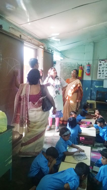 The warm afternoon started with the visit to Navneer Non Formal School. Anavi has a long association with this institute which also houses Navneer Old Age home. Geeta Sarkar whose stay is sponsored by us is an inmate here. At the other end of the spectrum, the young children, are always eager to see the aunties from Anavi. Their classes are being held in a room which has a tin roof. Needless to say, it gets very hot in the summers and leaks in winters. Anavi has promised to make a false ceiling in the class room. This will make studying much more comfortable and kids will able to focus their minds on their books.